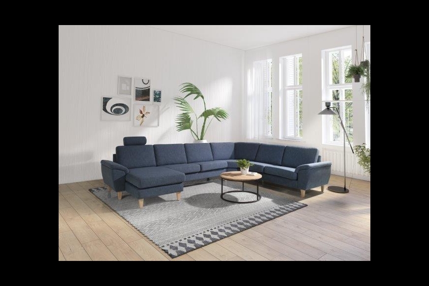 Den viste hjørnesofa / u-sofa står i stof 2 altid høj kvalitet af stof. Dette er PASSION Original, med det 15 cm ben og det klassiske forkant udtryk. Sofaen er vist med massive egeben.