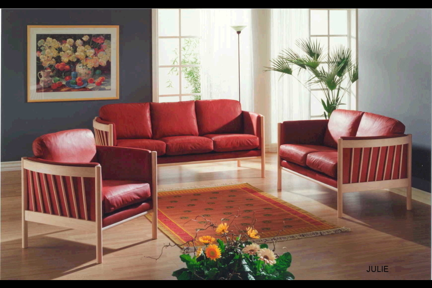 På billedet ses et 3 + 2 prs. Julie sofasæt, med sort læder, og bøge lak stel.