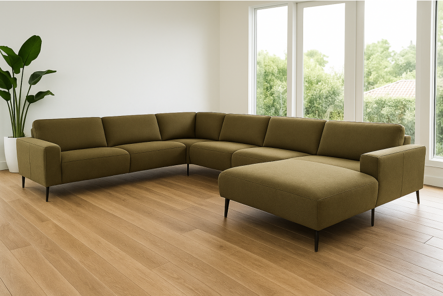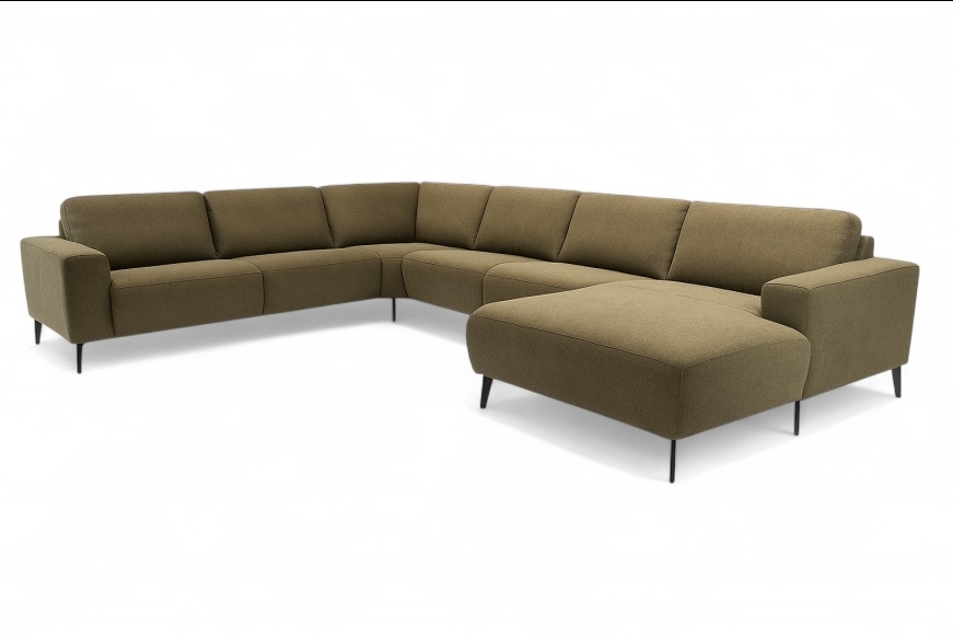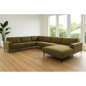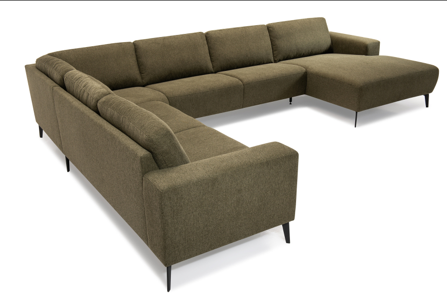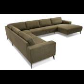 Stor og elegant u-sofa med ekstra bred chaiselong. Fås også i læder