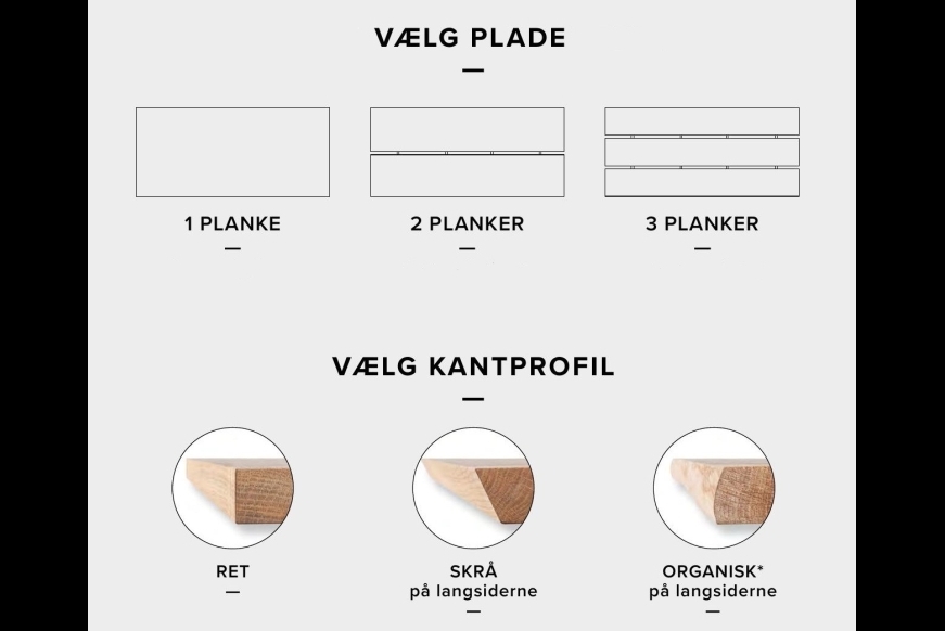 Bordet kan fås i mange forskellige behandlinger, vi har udvalgt 5 farver, som du kan vælge imellem her på hjemmesiden.
