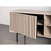 AKUSTIK SKÆNK fra Kristensen & Kristensen er designet med ønske om at forbedre akustikken i boligen samt opretholde et pænt udtryk. Kombinationen af trælameller og filt, er ikke blot tænkt ind i designet for at fornøje øjet, men i lige så høj grad for at absorbere rumklang. Skænken er vist her i massiv hvidolieret ask med sort metal sokkel.