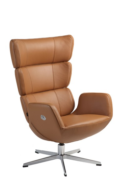 Komfortabel lænestol i semianilin læder og skald i valnød med swingback funktion. Fås også i stof.